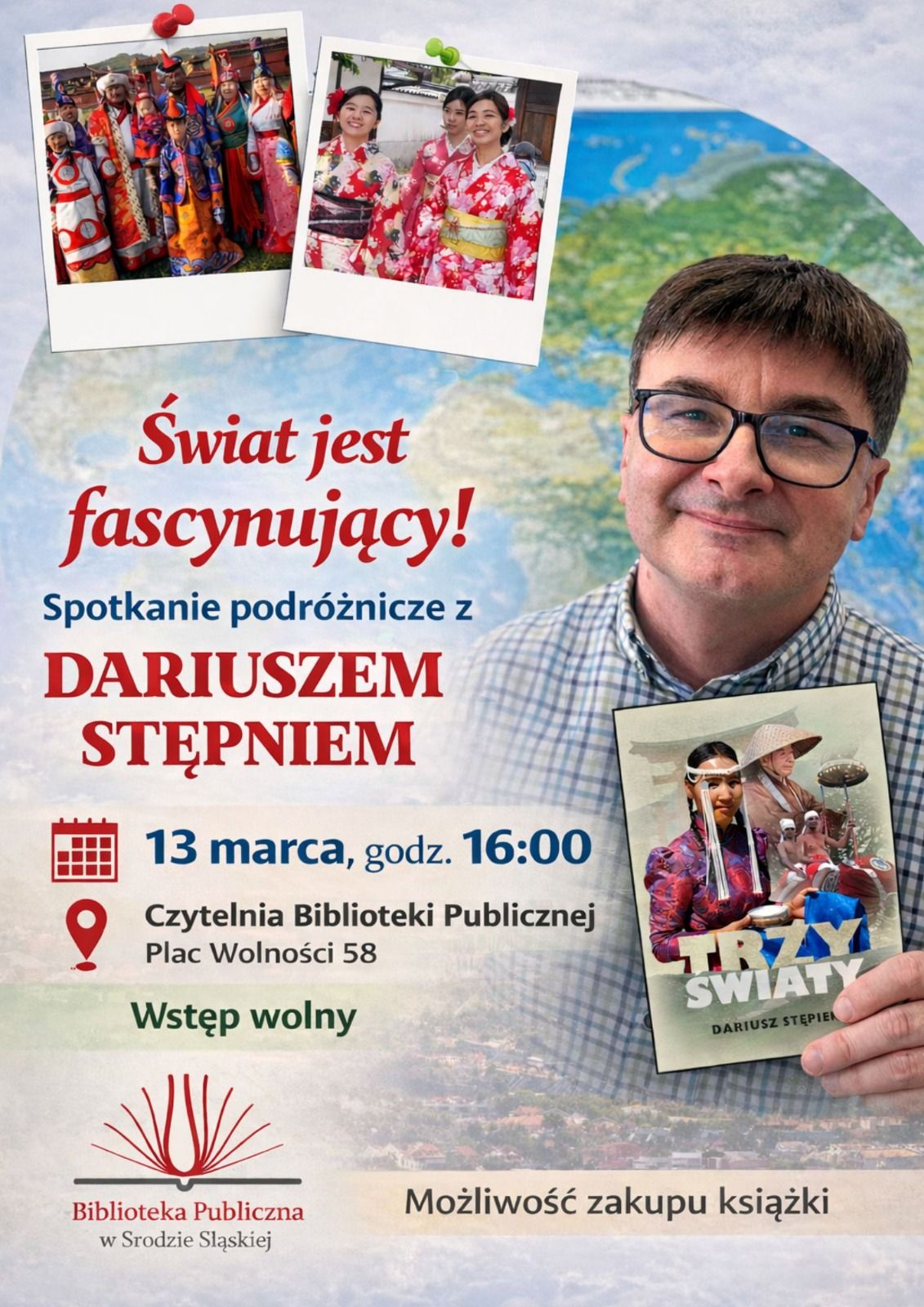 13 marca o godz. 16:00 zapraszamy do Czytelni Biblioteki na wyjątkowe spotkanie z Dariuszem Stępniem – geografem, podróżnikiem, dziennikarzem i autorem książki „Trzy światy. Zapiski z podróży po Sri Lance, Mongolii i Japonii”